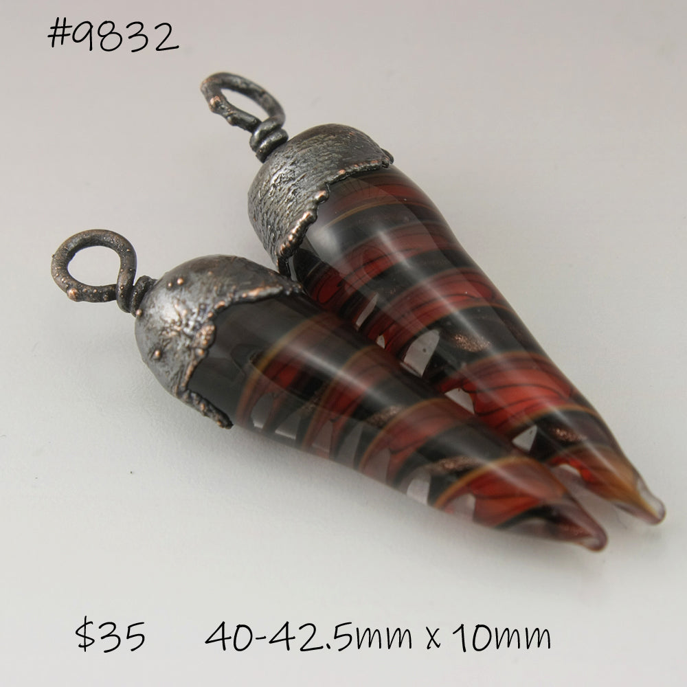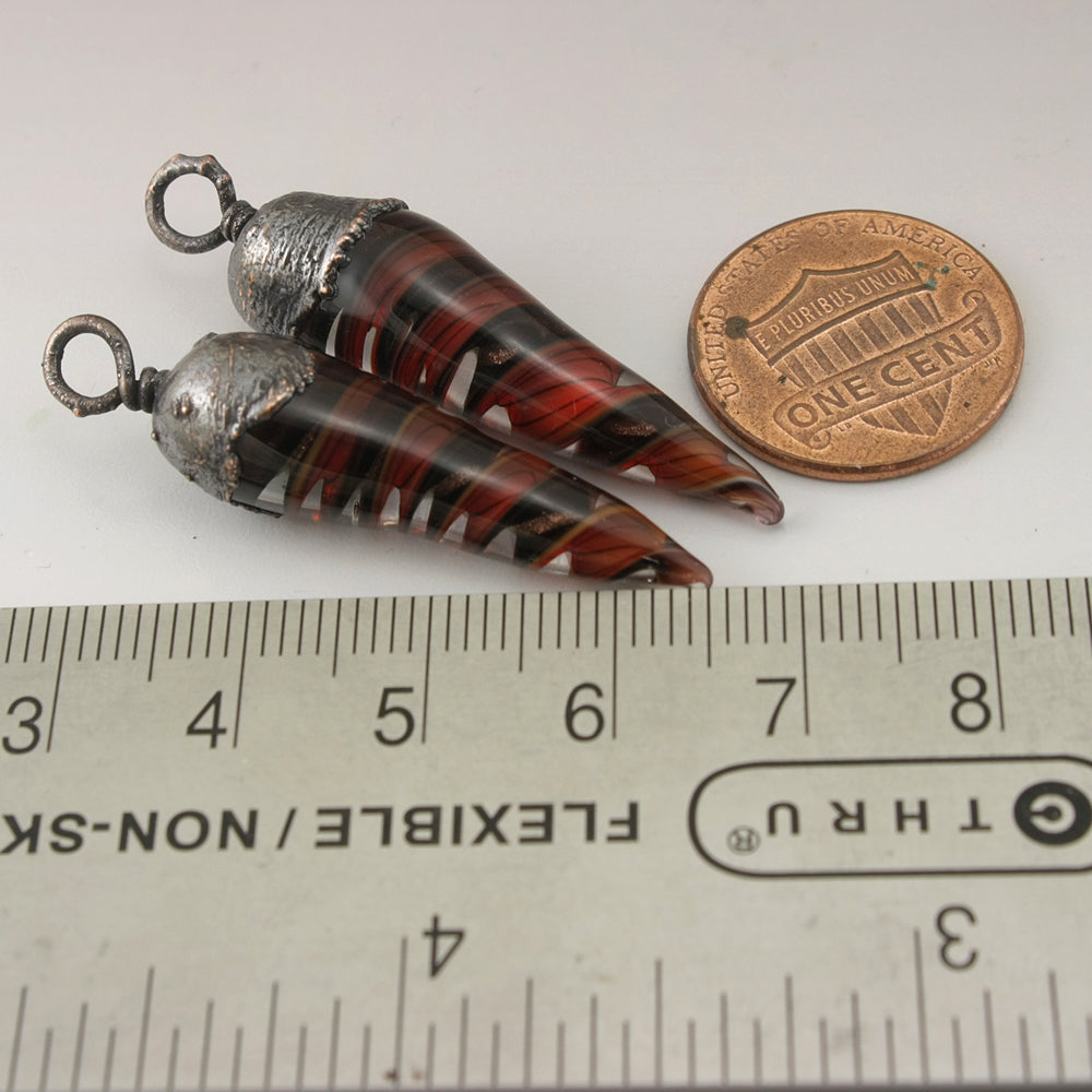 Handmade red with black pinstripes and black with goldstone helix twisty long tapered pendulum shape with Electroforming Oxidized single