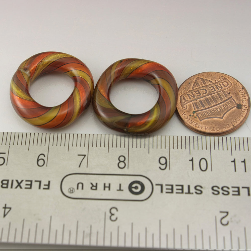 Handmade Red, orange, yellow and black with goldstone sparkle twisty circle loop pair. This one does have a few tiny bubbles
