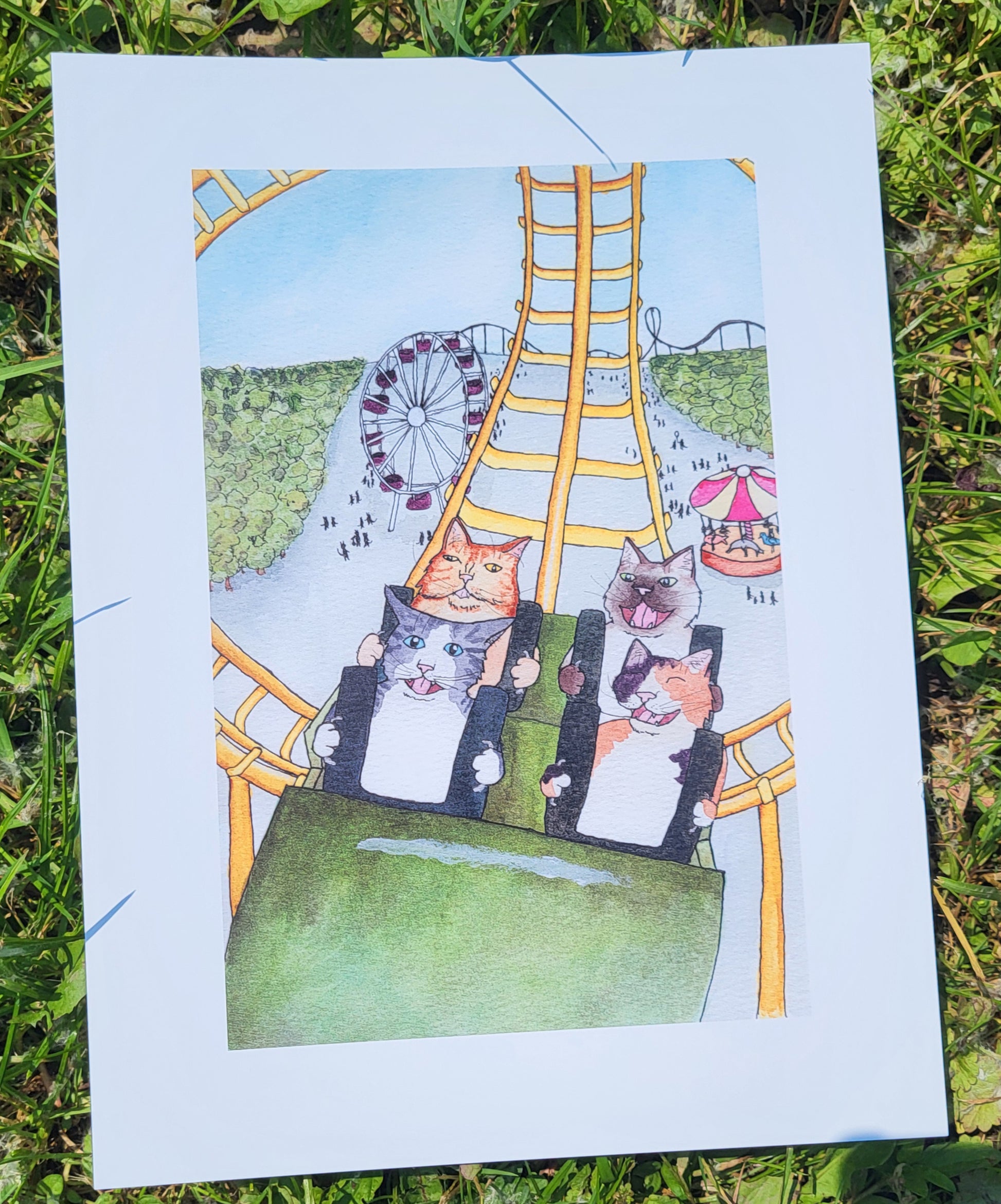These four friends are spending a day at the park and enjoying a rollercoaster each in their own way. Two are pretty pleased, one is a little scared and in the back, one is feeling that loop-de-loop in the pit of his tummy.