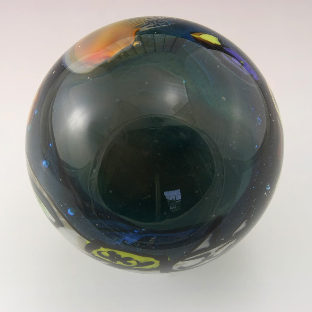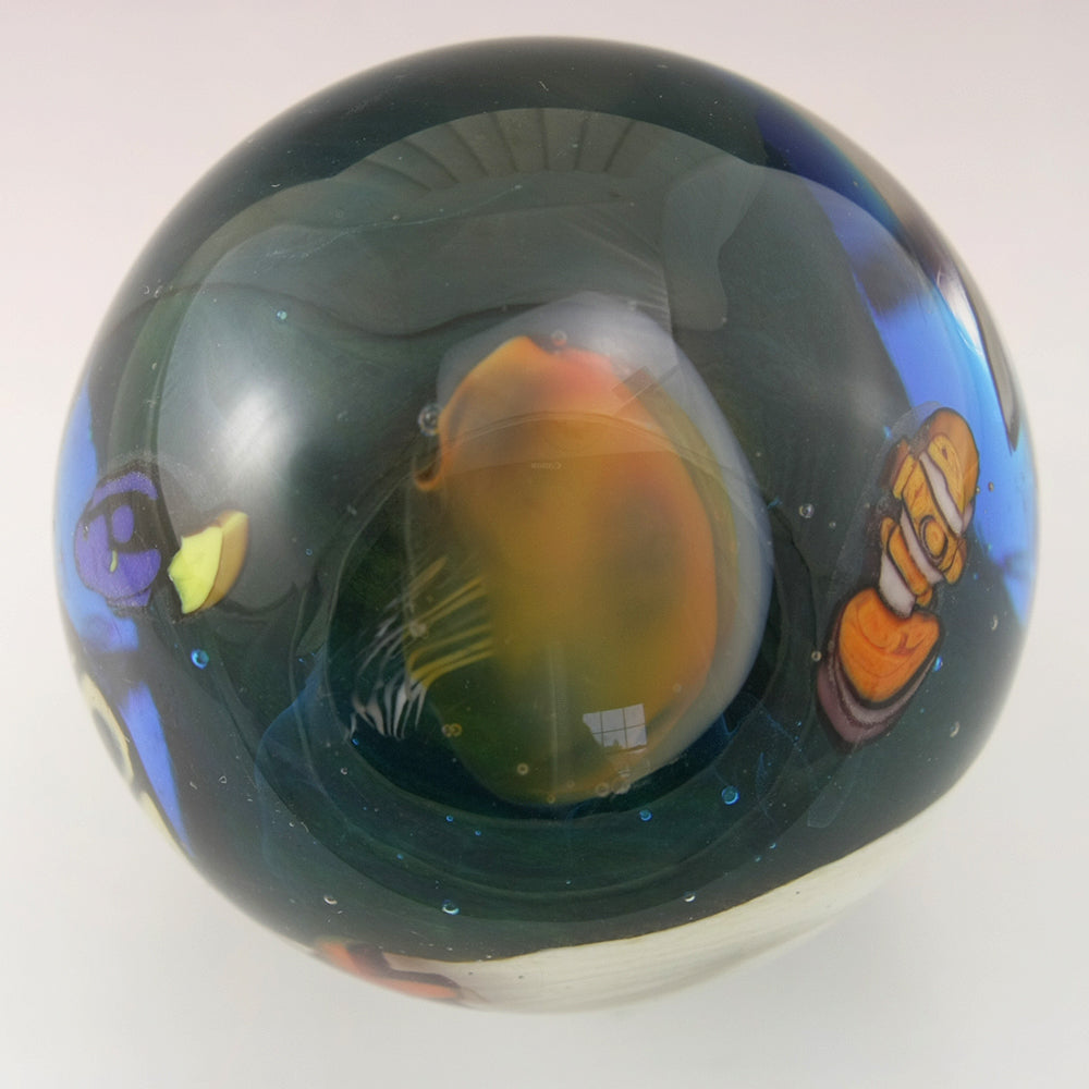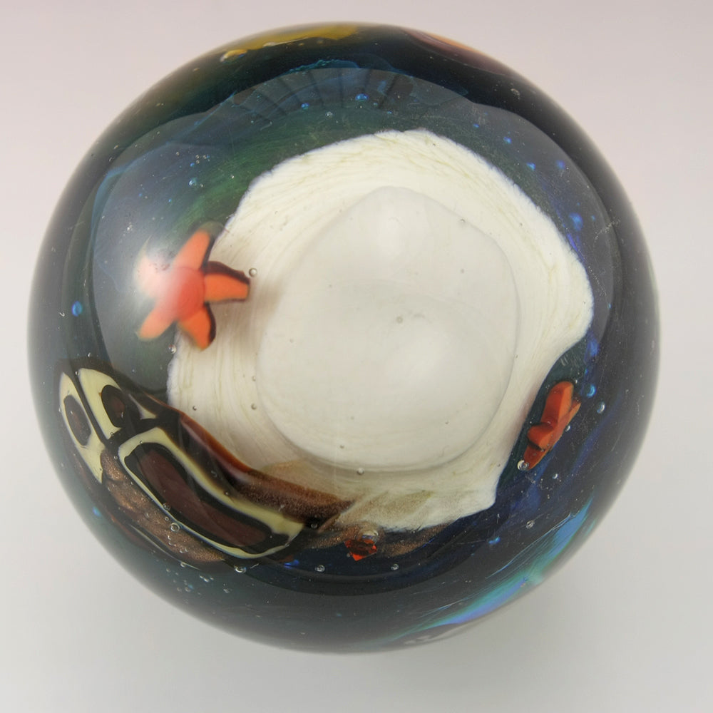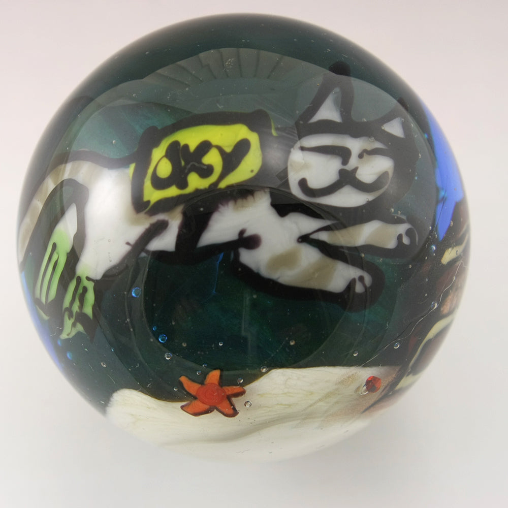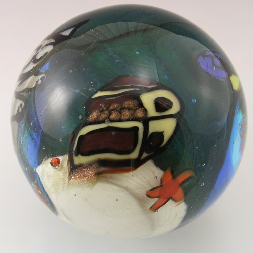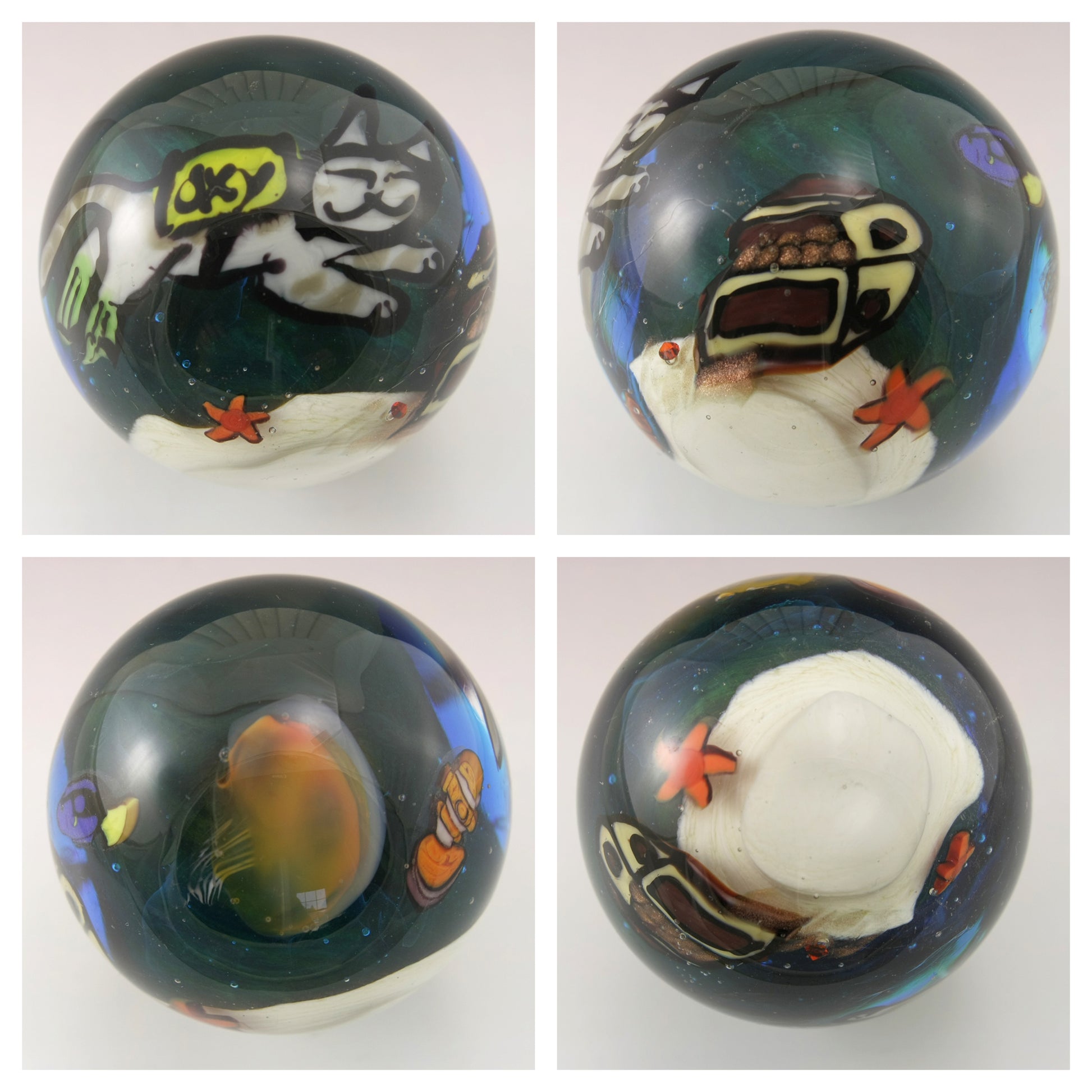 Lots of love and details went into this handmade marble. Scuba kitty is drawn in stringer along with the treasure chest. The treasure chest is overflowing with sparkling goldstone and a cubic zirconia jewel. I have some sea life murrine including two starfish and a blue tang and orange clownfish. And I have a ghostly jellyfish making his way across the scenery. This large marble has been heavily encased in clear to magnify