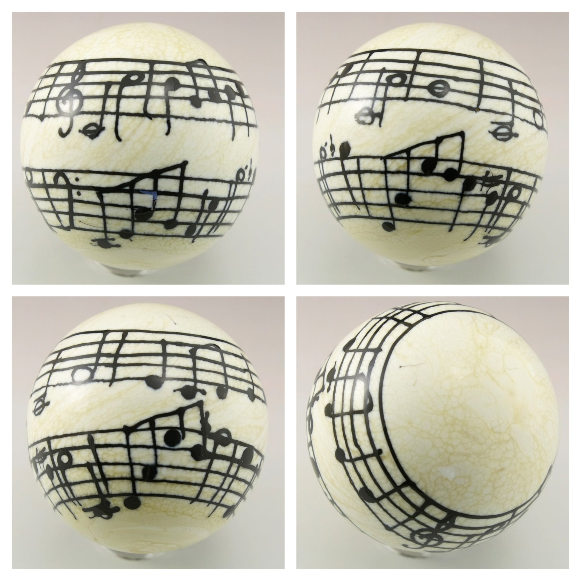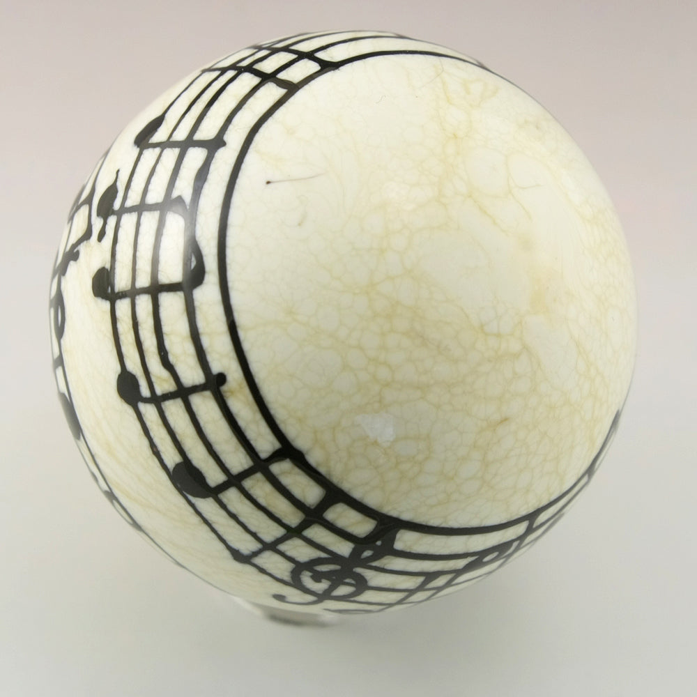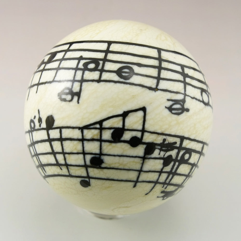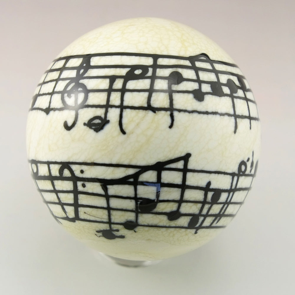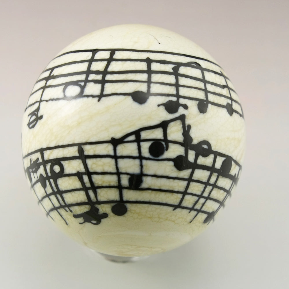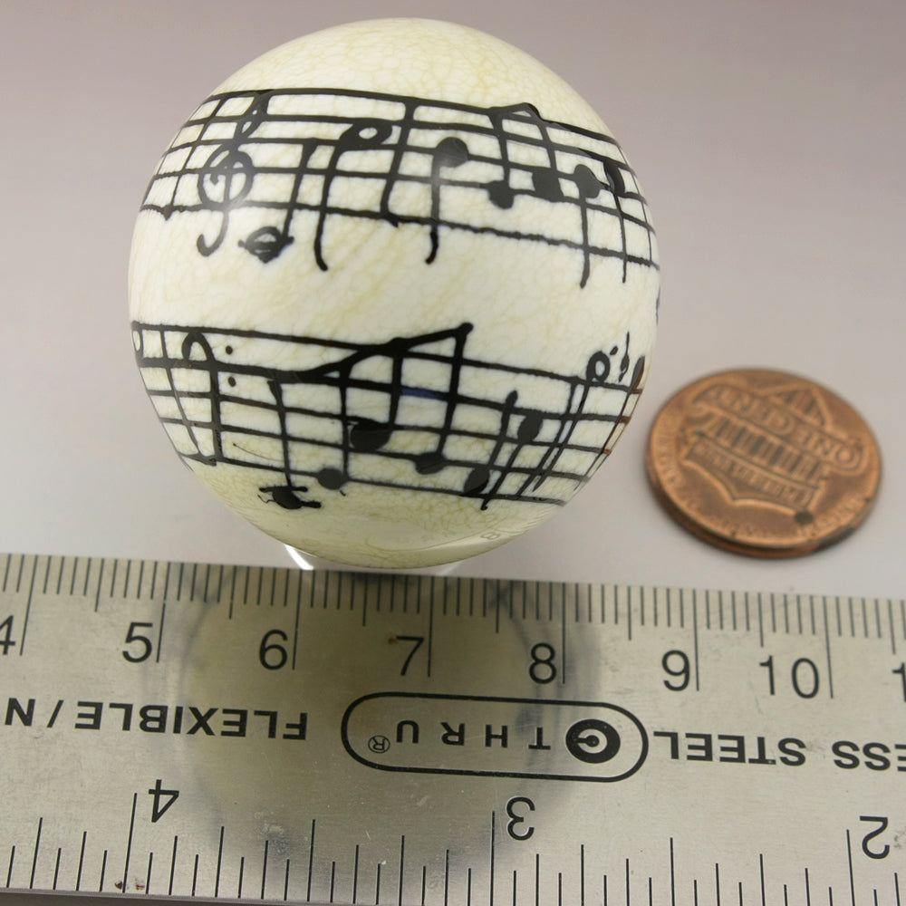 Ivory marble with black music notes and manuscript drawn freehand at the torch with black stringer. This one is based on the first few measures of "Somewhere over the Rainbow" from the Wizard of Oz.