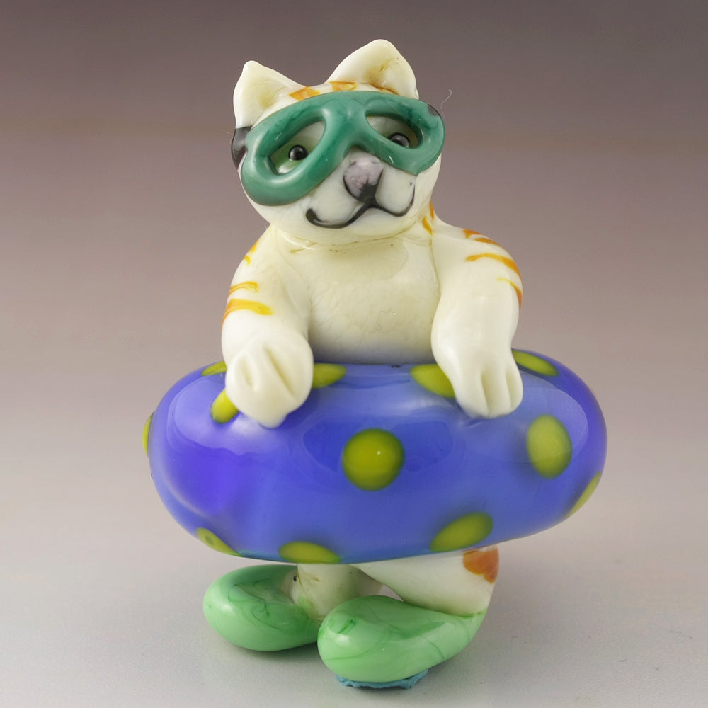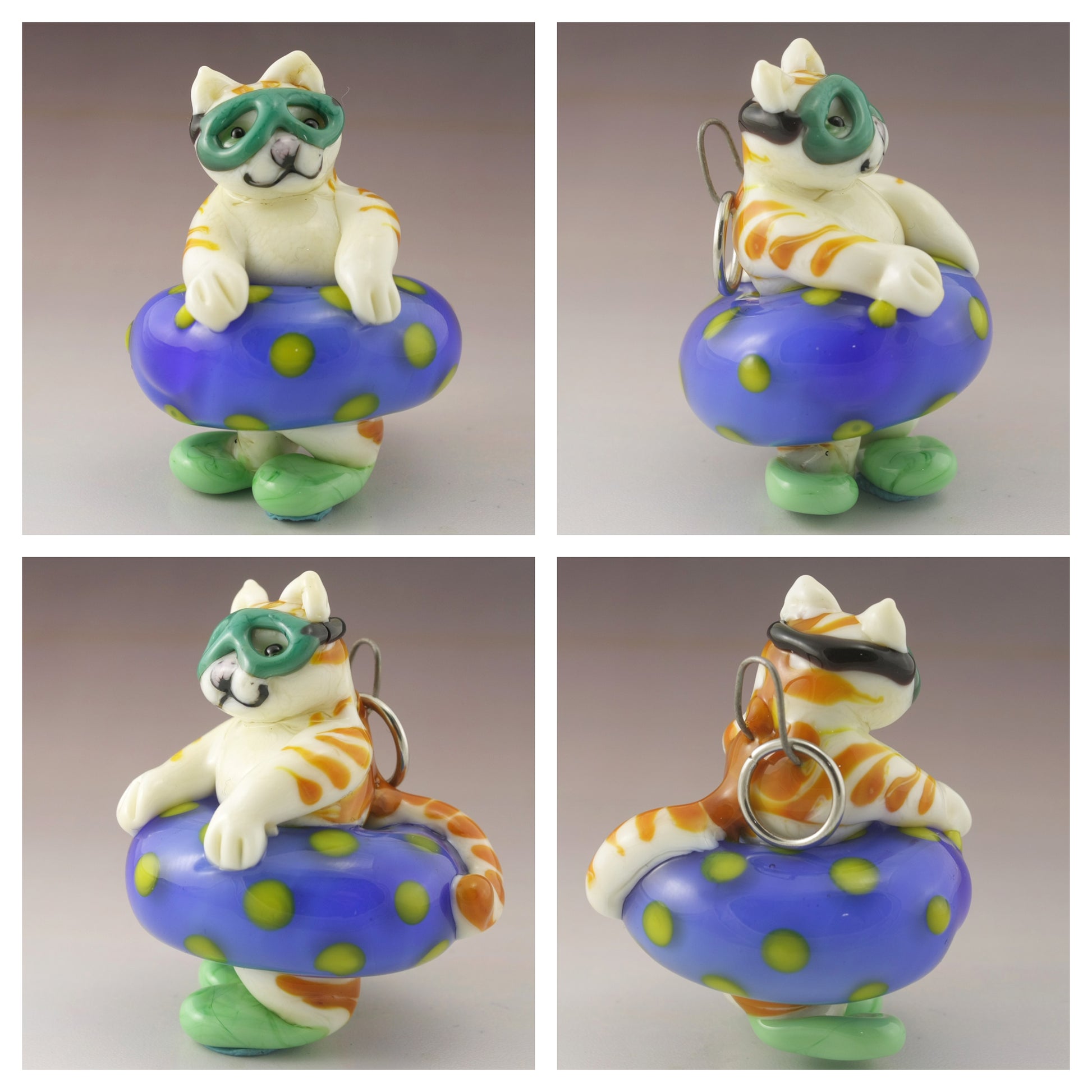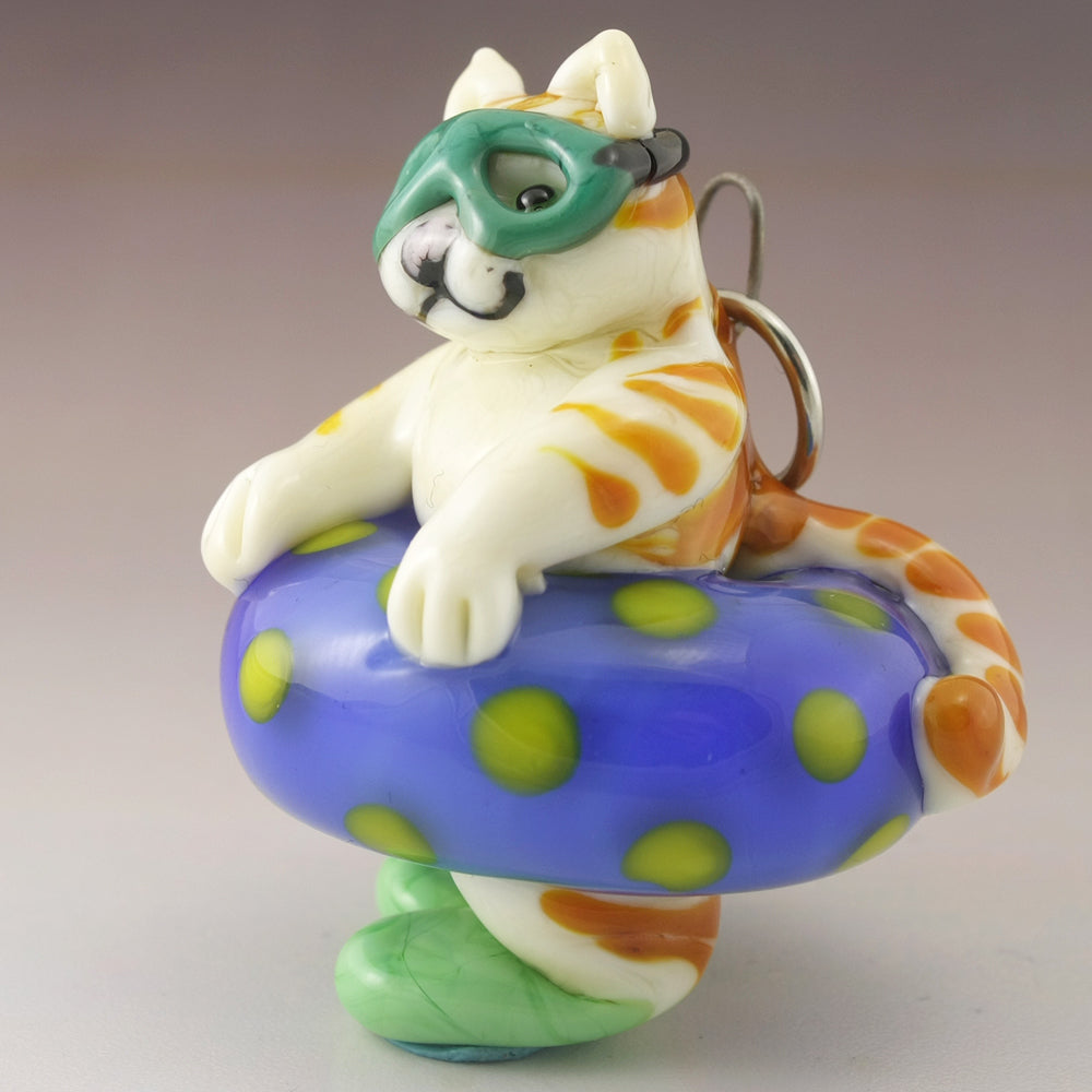 This adorable glass kitty sculpture is a wearable pendant made in soft glass. This ivory with light orange yellow tabby stripes is ready for Summer. He is wearing a blue and yellow polka dotted inner tube. He has green googles for snorkling and green crocs. I've used kanthal wire and a stainless steel jumpring to make him a wearable piece of art for you