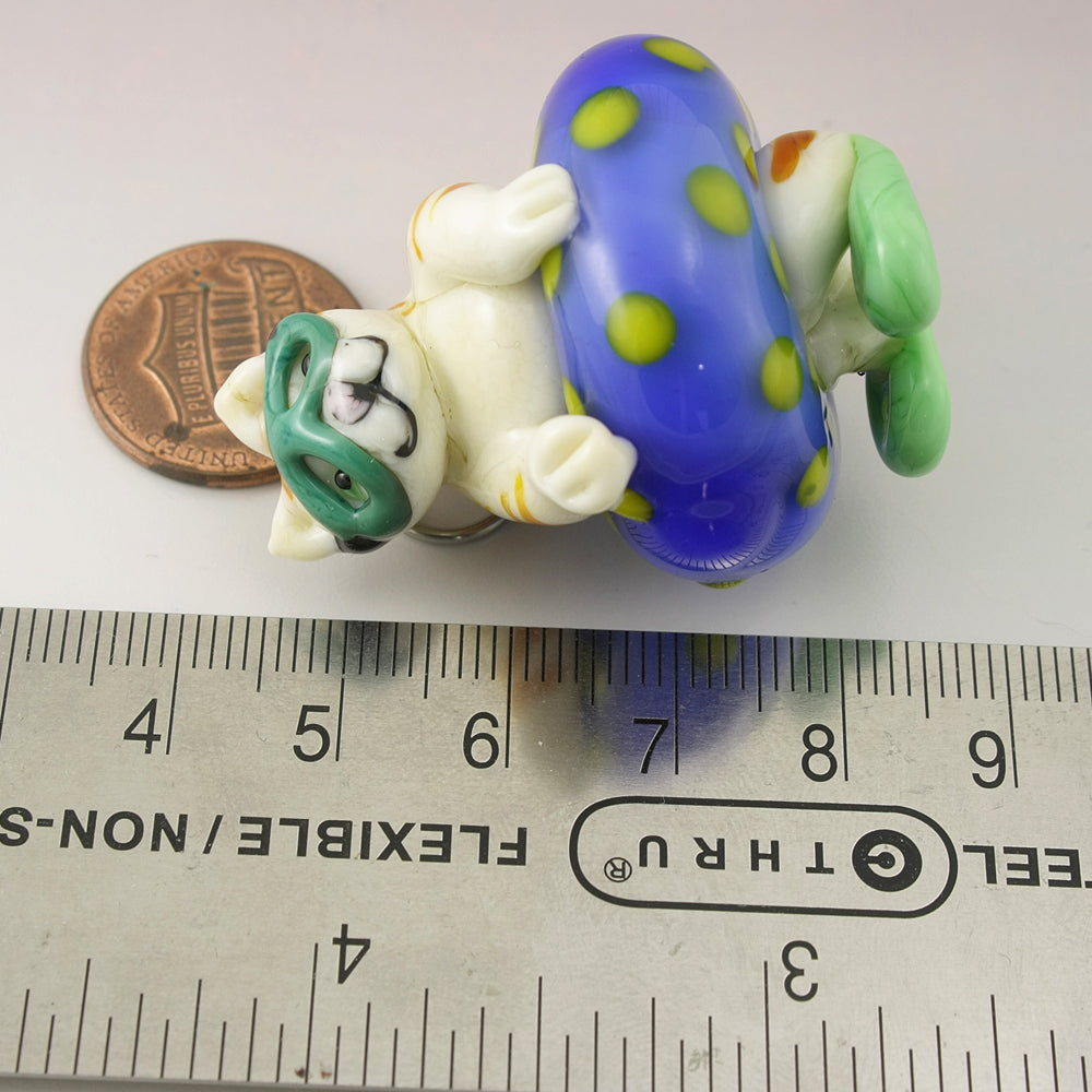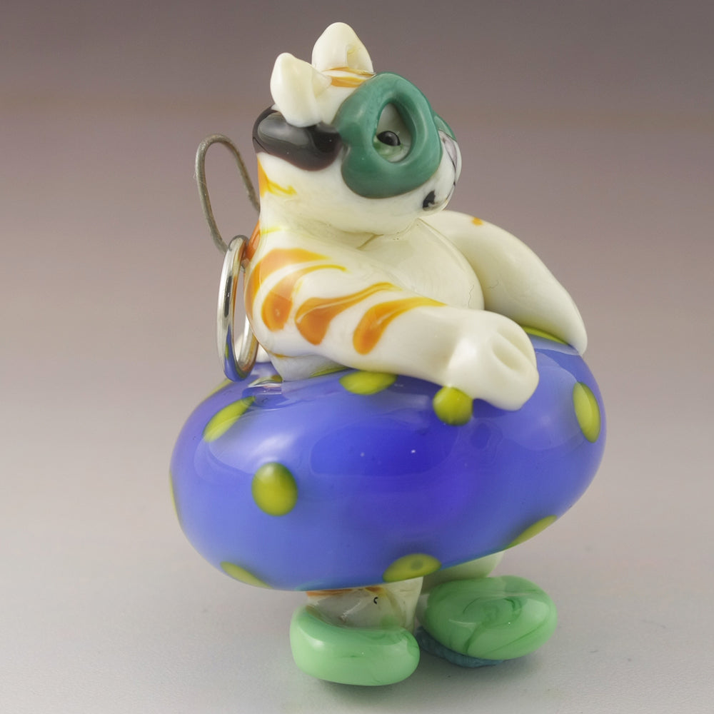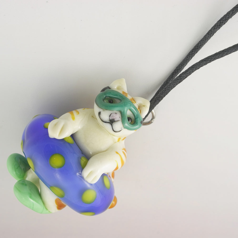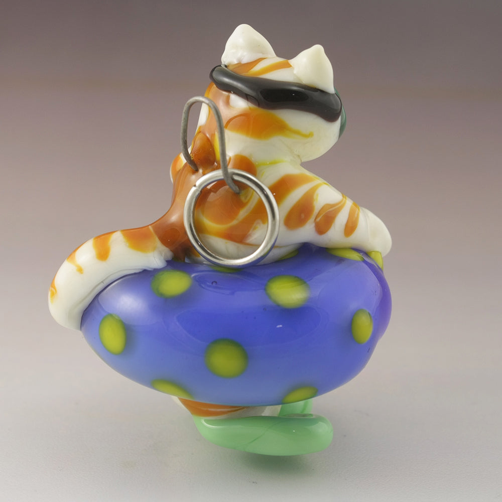 This adorable glass kitty sculpture is a wearable pendant made in soft glass. This ivory with light orange yellow tabby stripes is ready for Summer. He is wearing a blue and yellow polka dotted inner tube. He has green googles for snorkling and green crocs. I've used kanthal wire and a stainless steel jumpring to make him a wearable piece of art for you