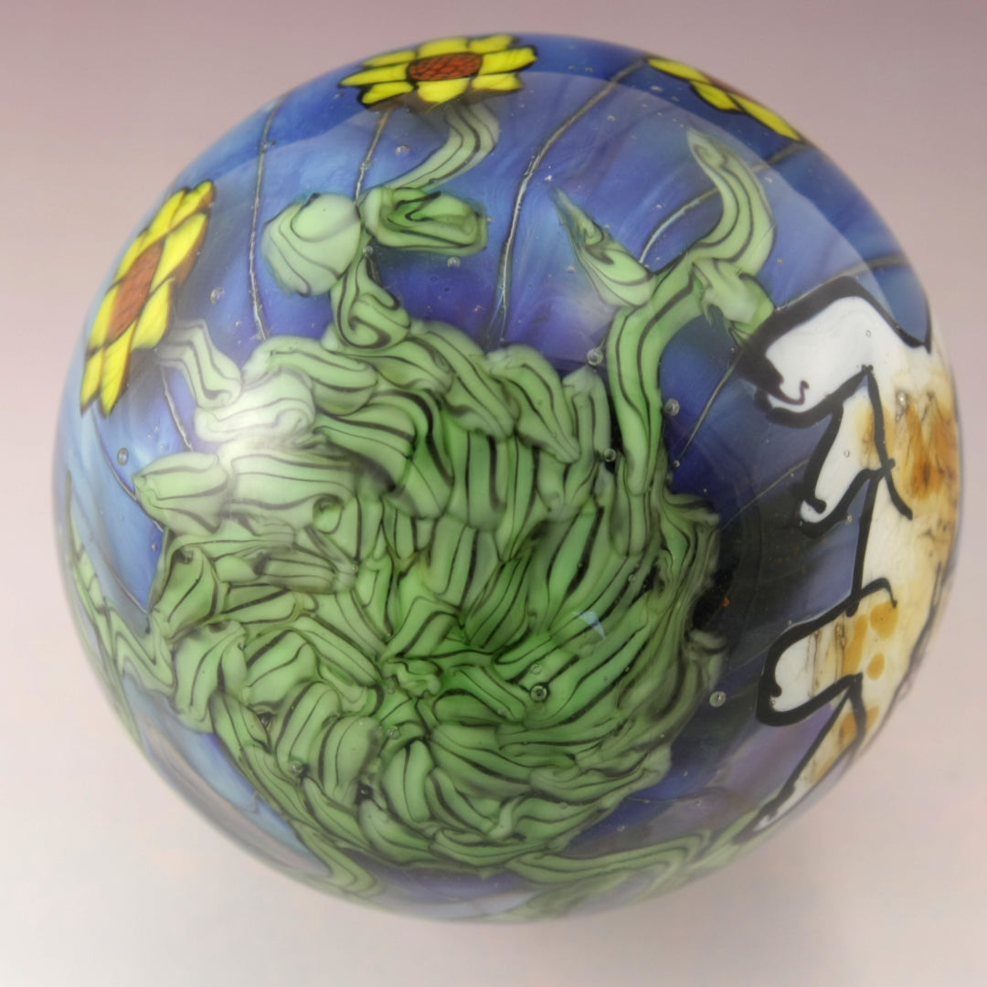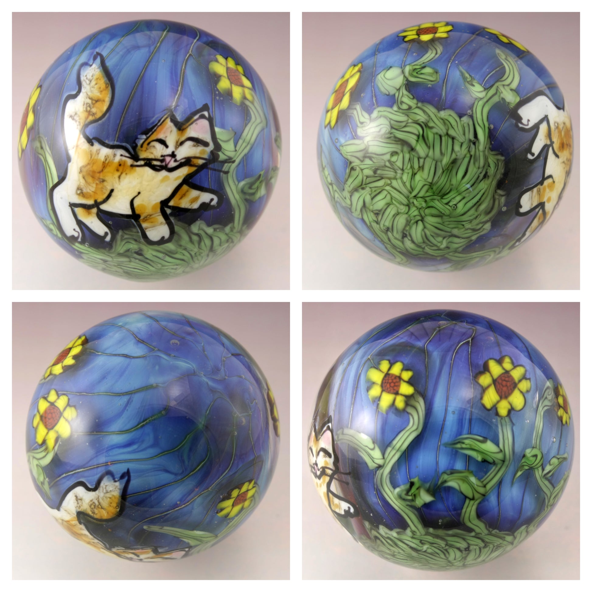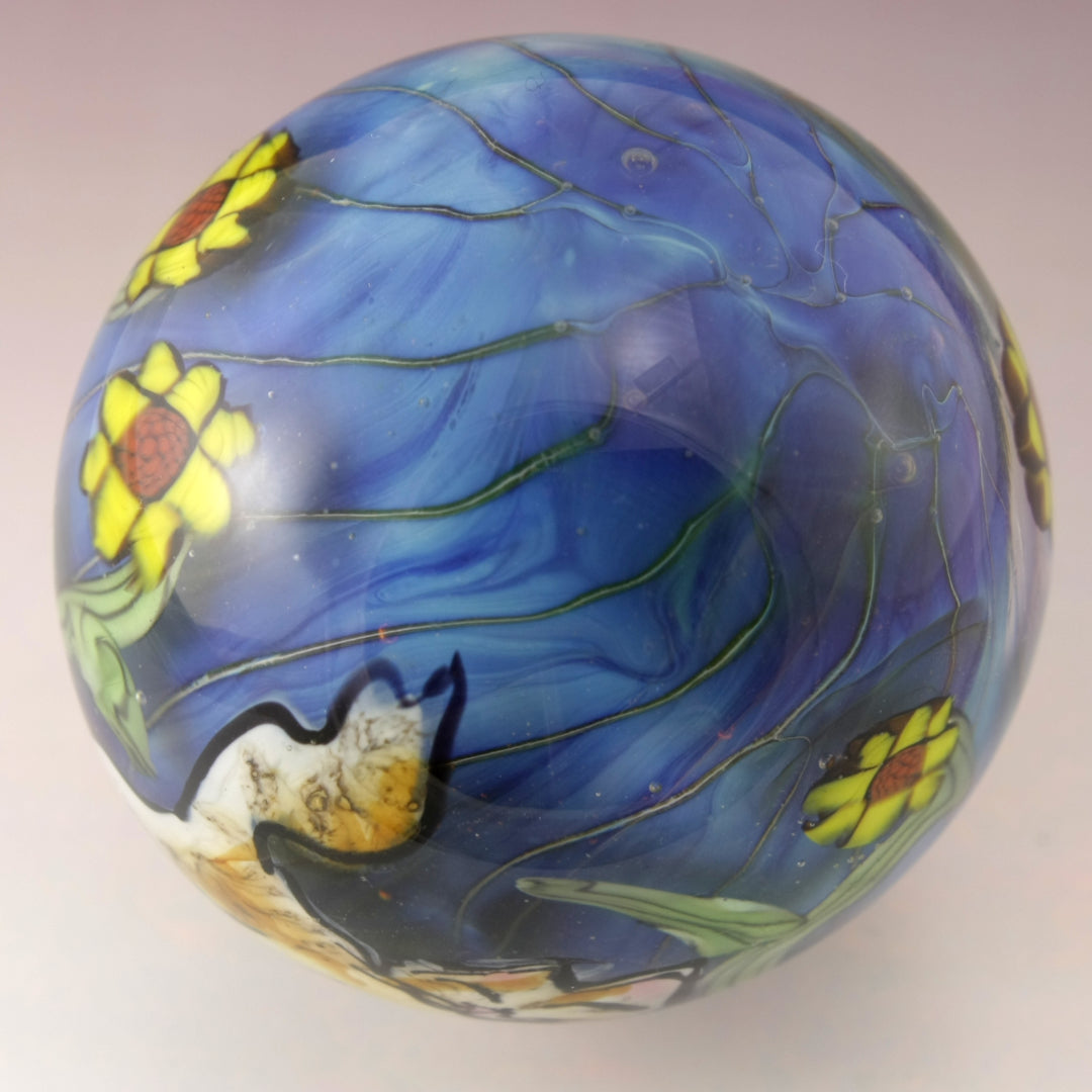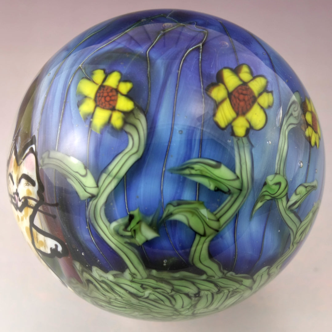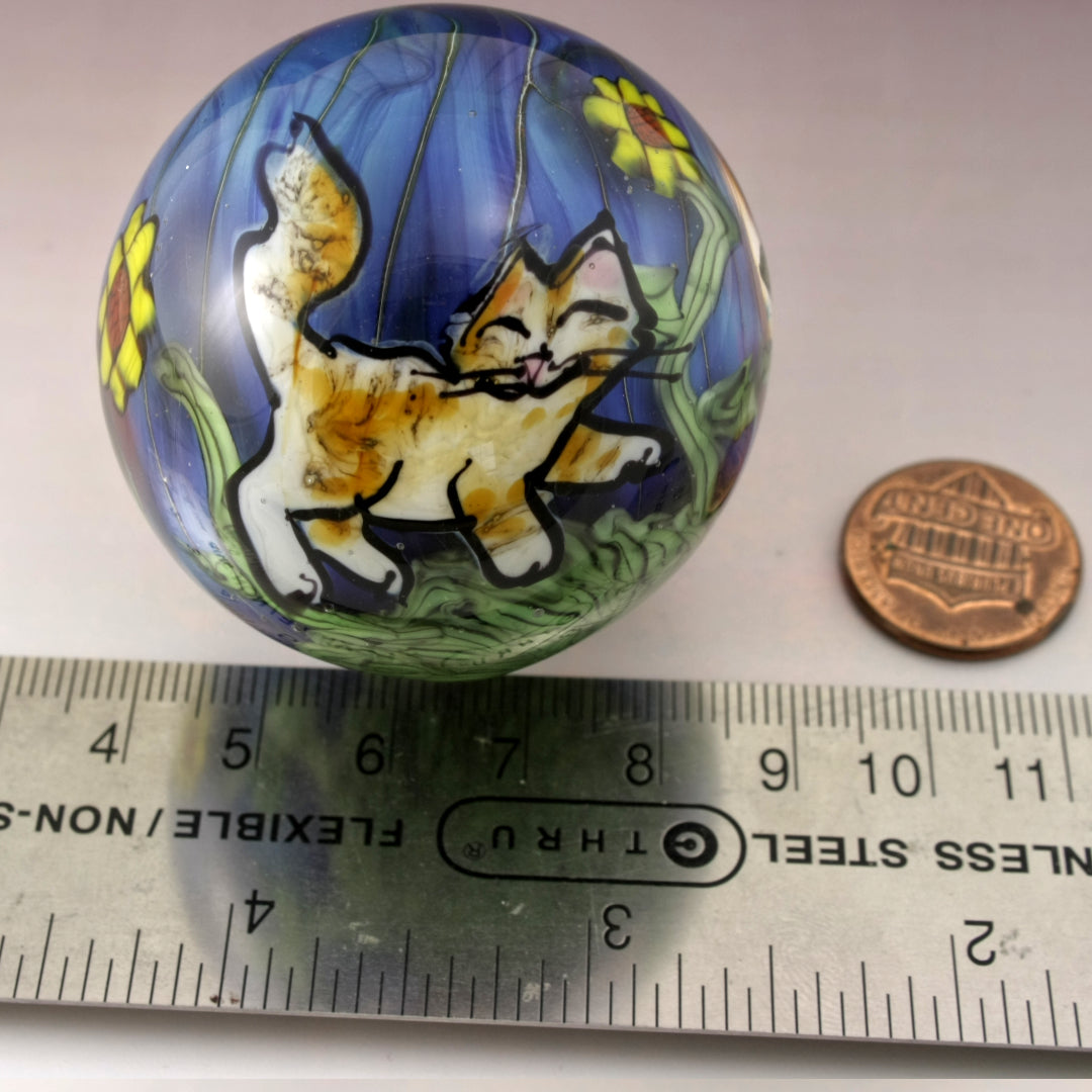 This handmade lampwork marble features a lustrous blue background with sunflowers on green variegated vines. I've drawn a tabby kitty with a pink nose and hint of amber coloring. This large marble has been heavily encased in clear to magnify