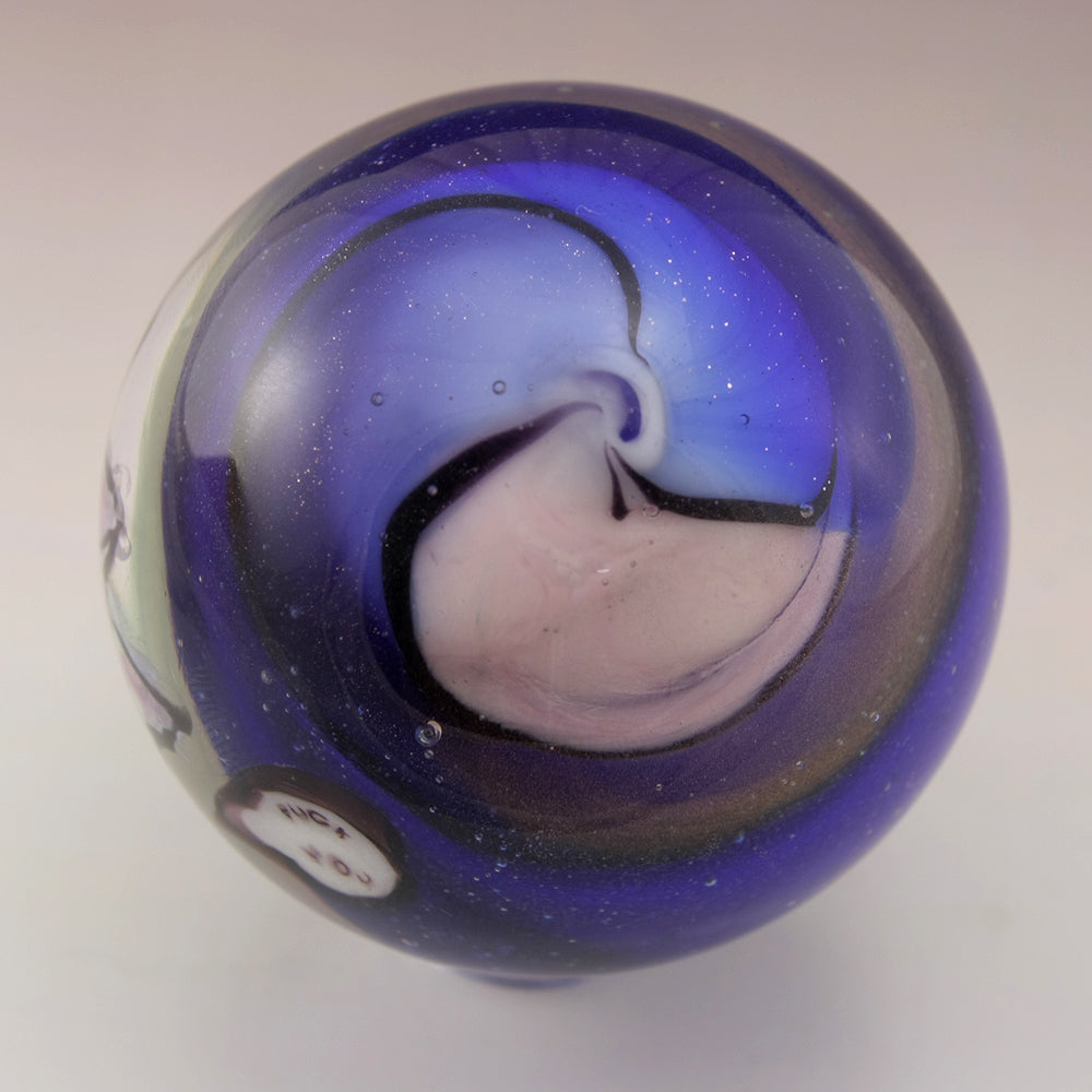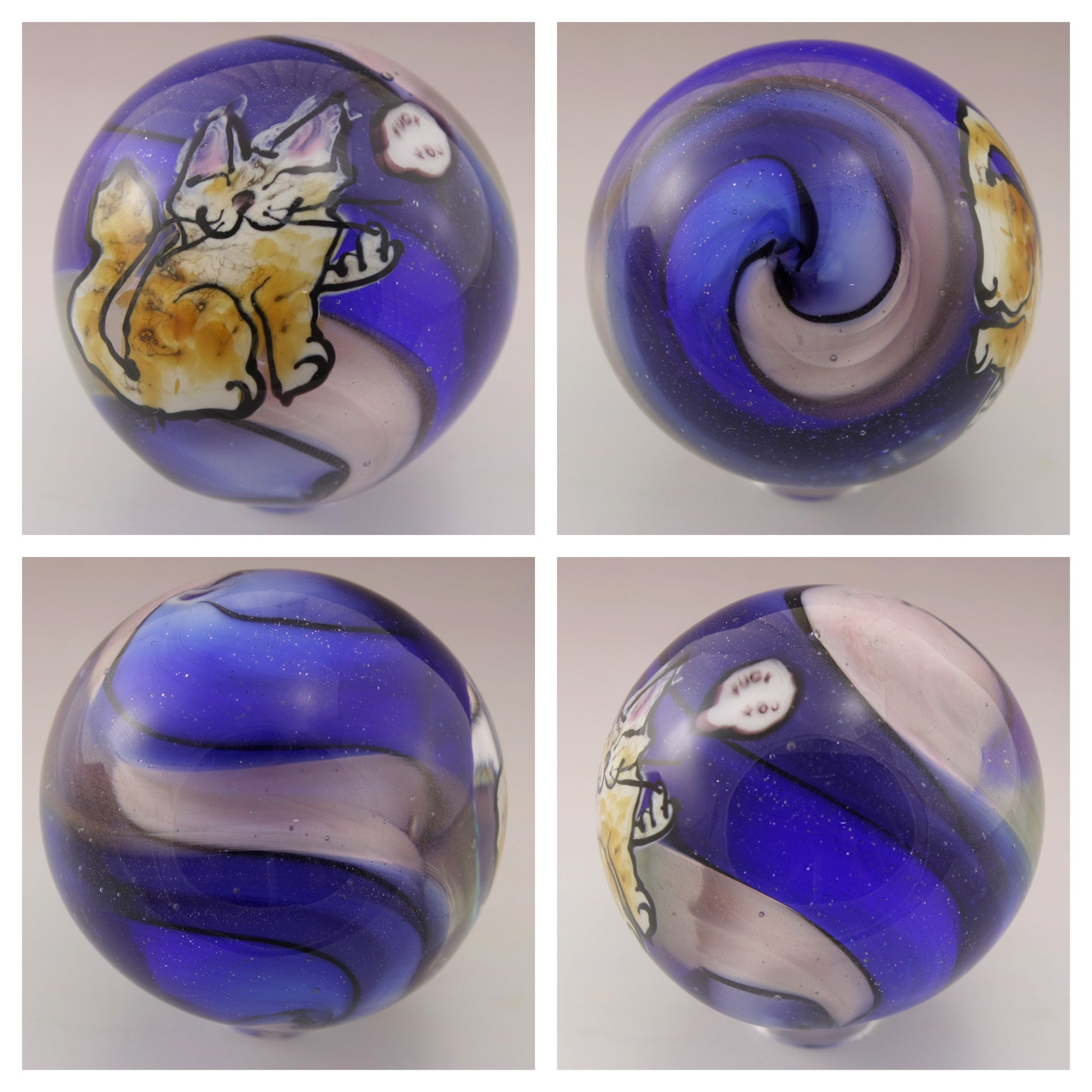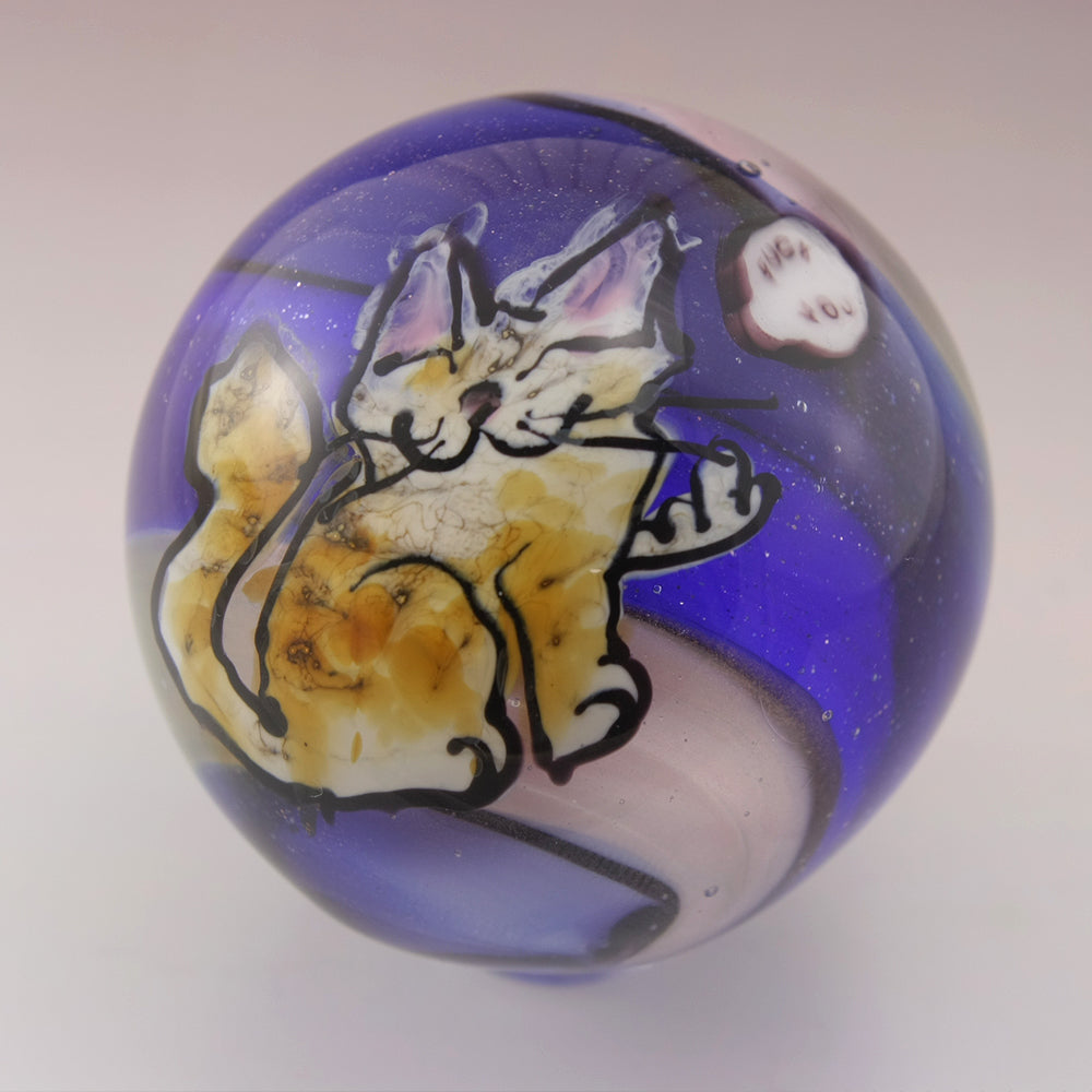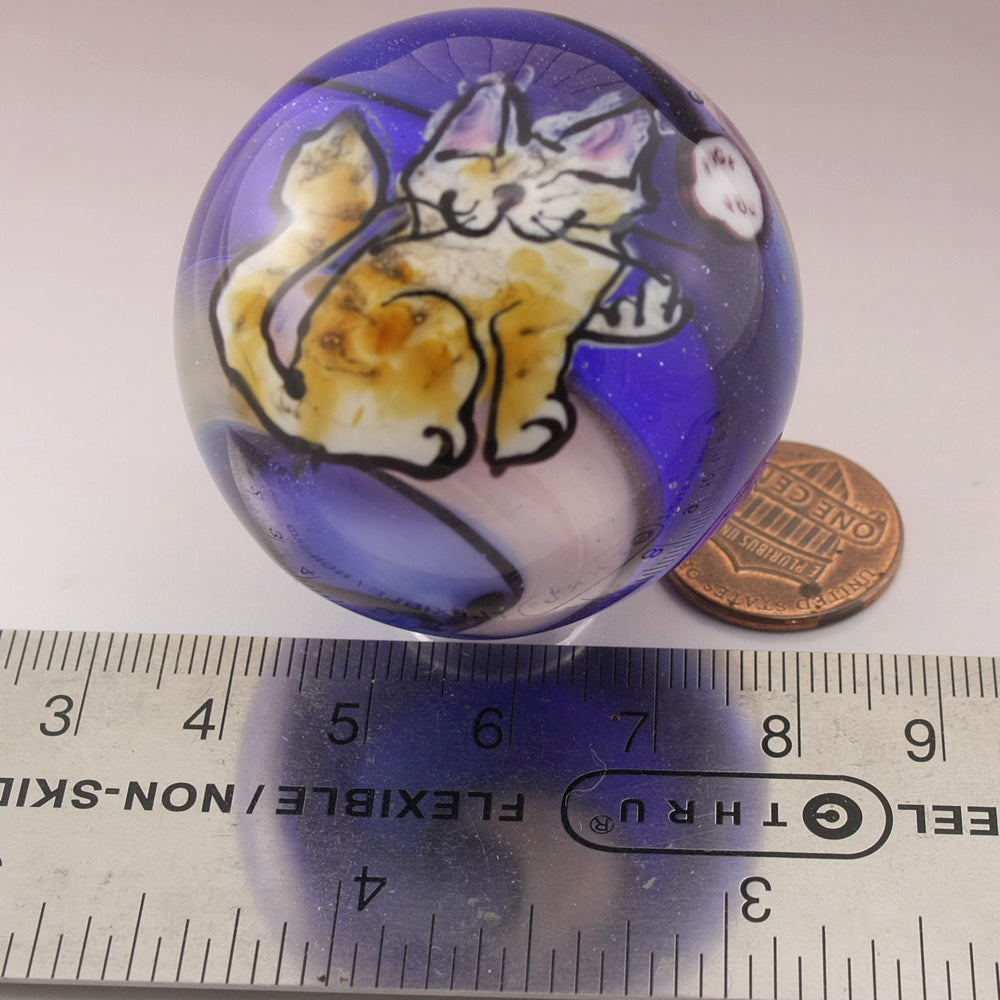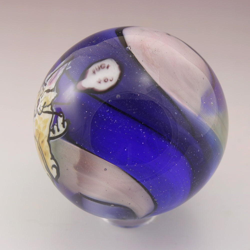 This handmade lampwork marble features a happy kitty with a "Fuck you" speech bubble murrine. The kitty has been drawn with glass stringer with a topaz coloring and pink ears. The background is a swirl of cobalt blue, purple and pale pink. This large marble has been heavily encased in clear to magnify