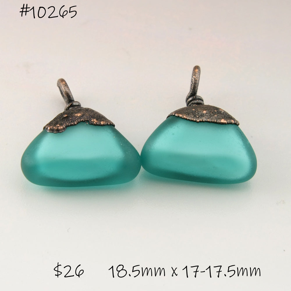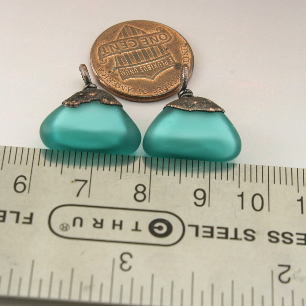Handmade Etched teal blue green over white Lampwork Glass geometric flat triangles with Copper Electroforming Oxidized pair