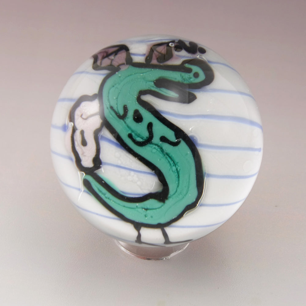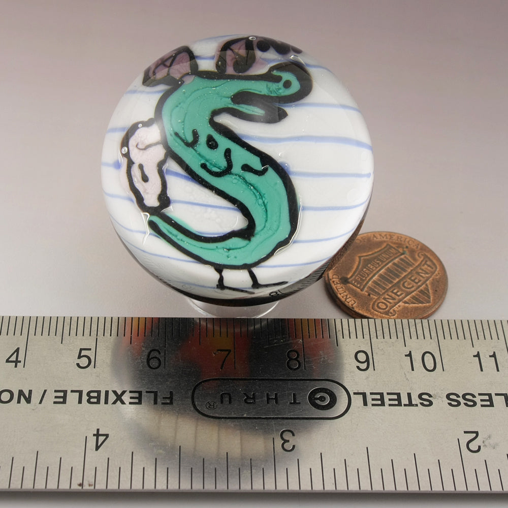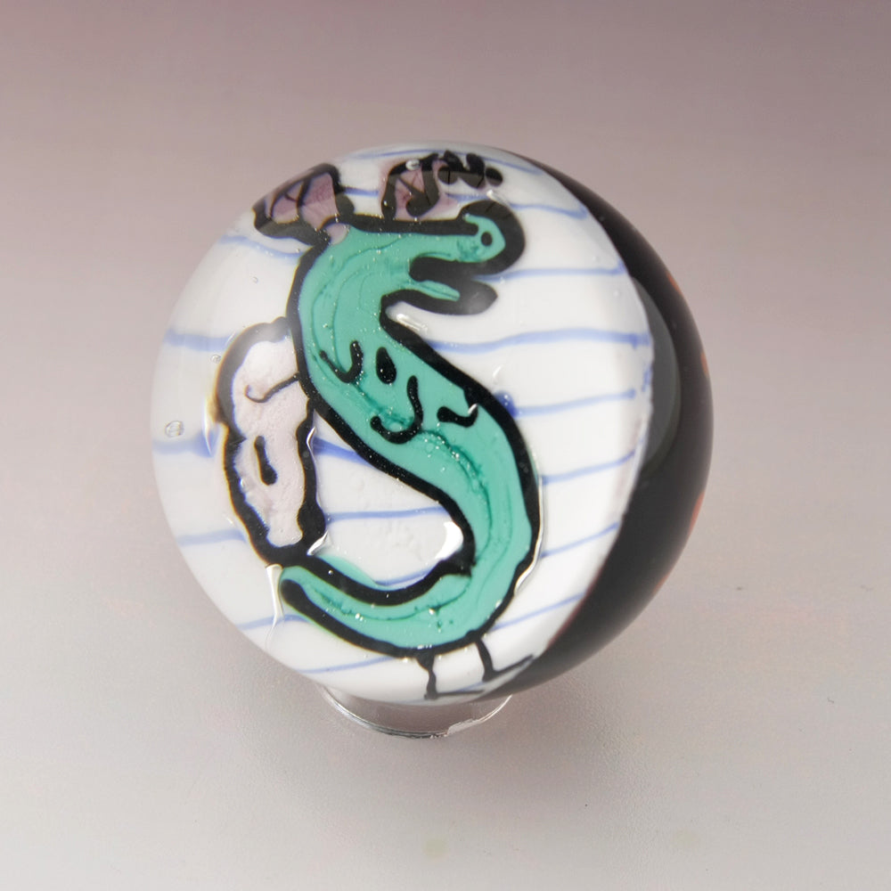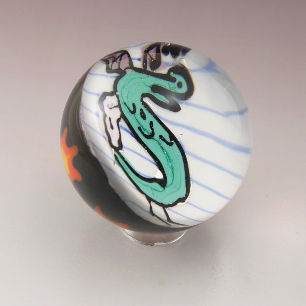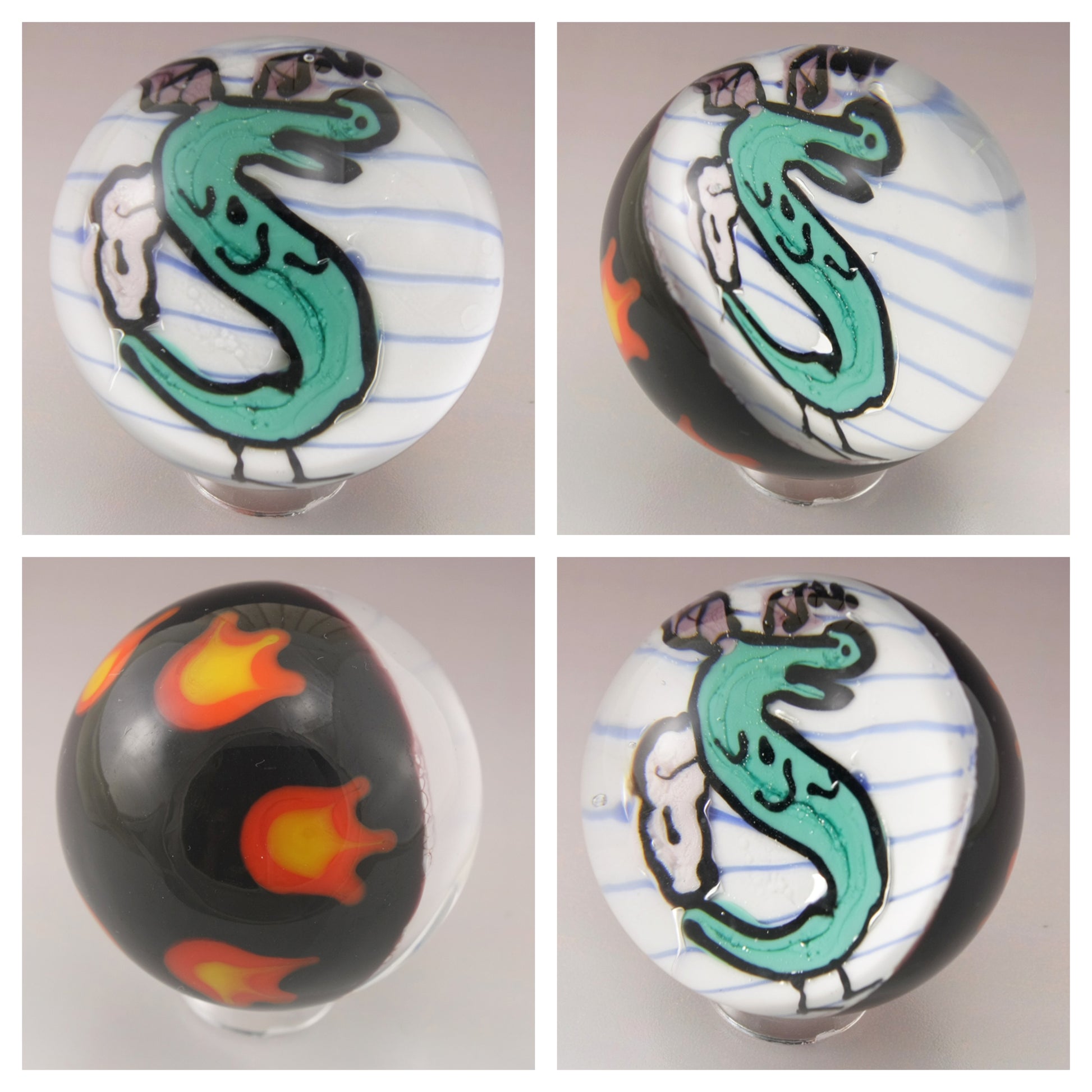 This handmade lampwork marble features Trogdor, the burninator! on a lined white paper background. He is under a heavy layer of clear to magnify and the backside is orange and yellow flames on a black background