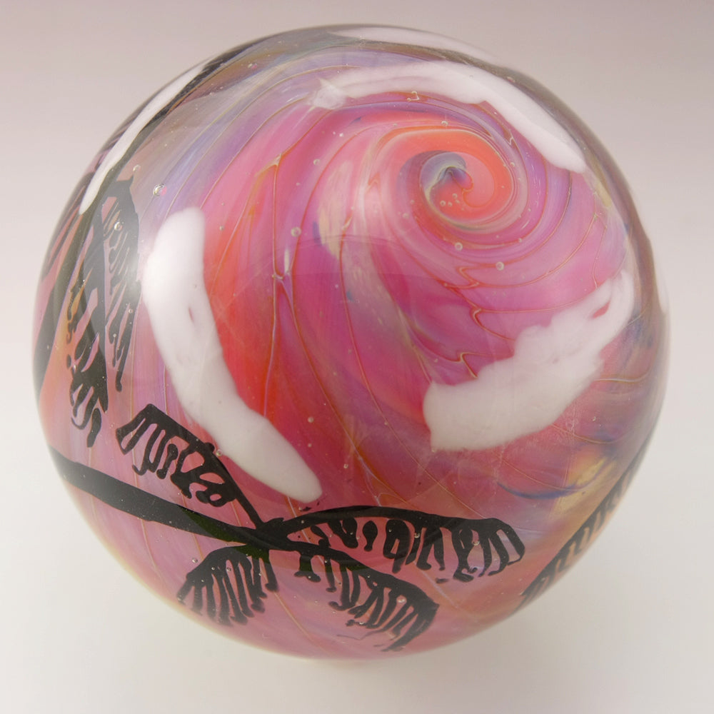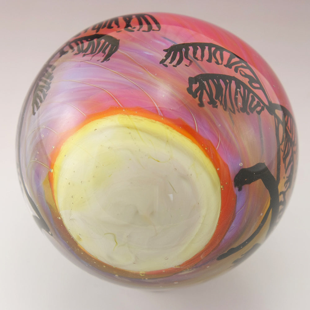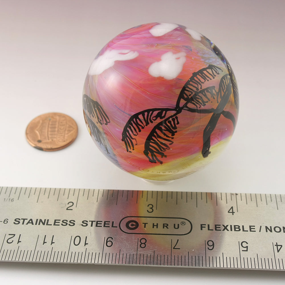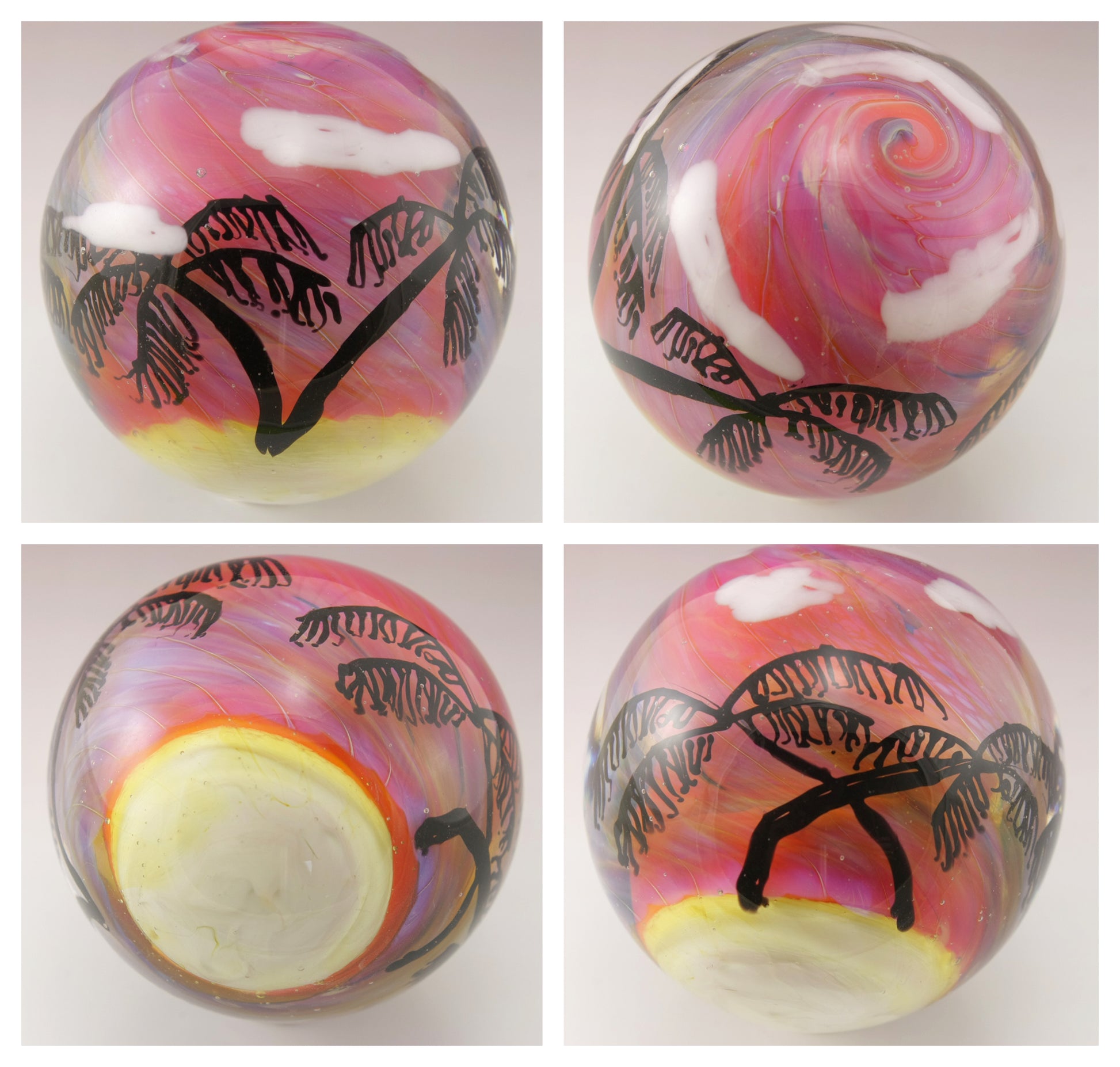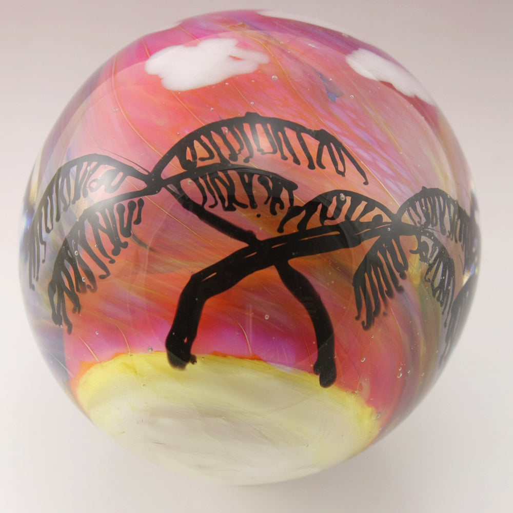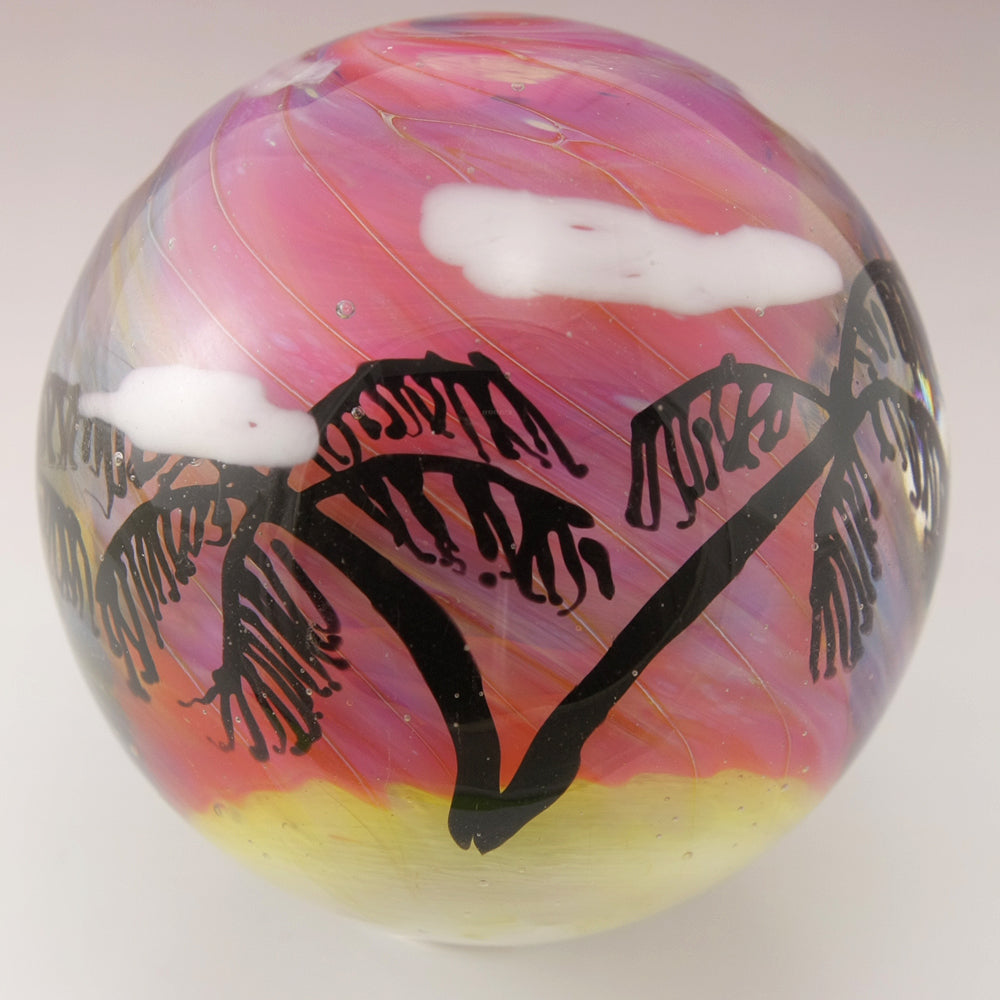 This handmade lampwork glass bead is made from layers of color that produce a tropical orange pink with a hint of blue. Black palm tree silhouettes come from ivory ground for your tropical vacation. Designs are under multiple layers of clear to magnify