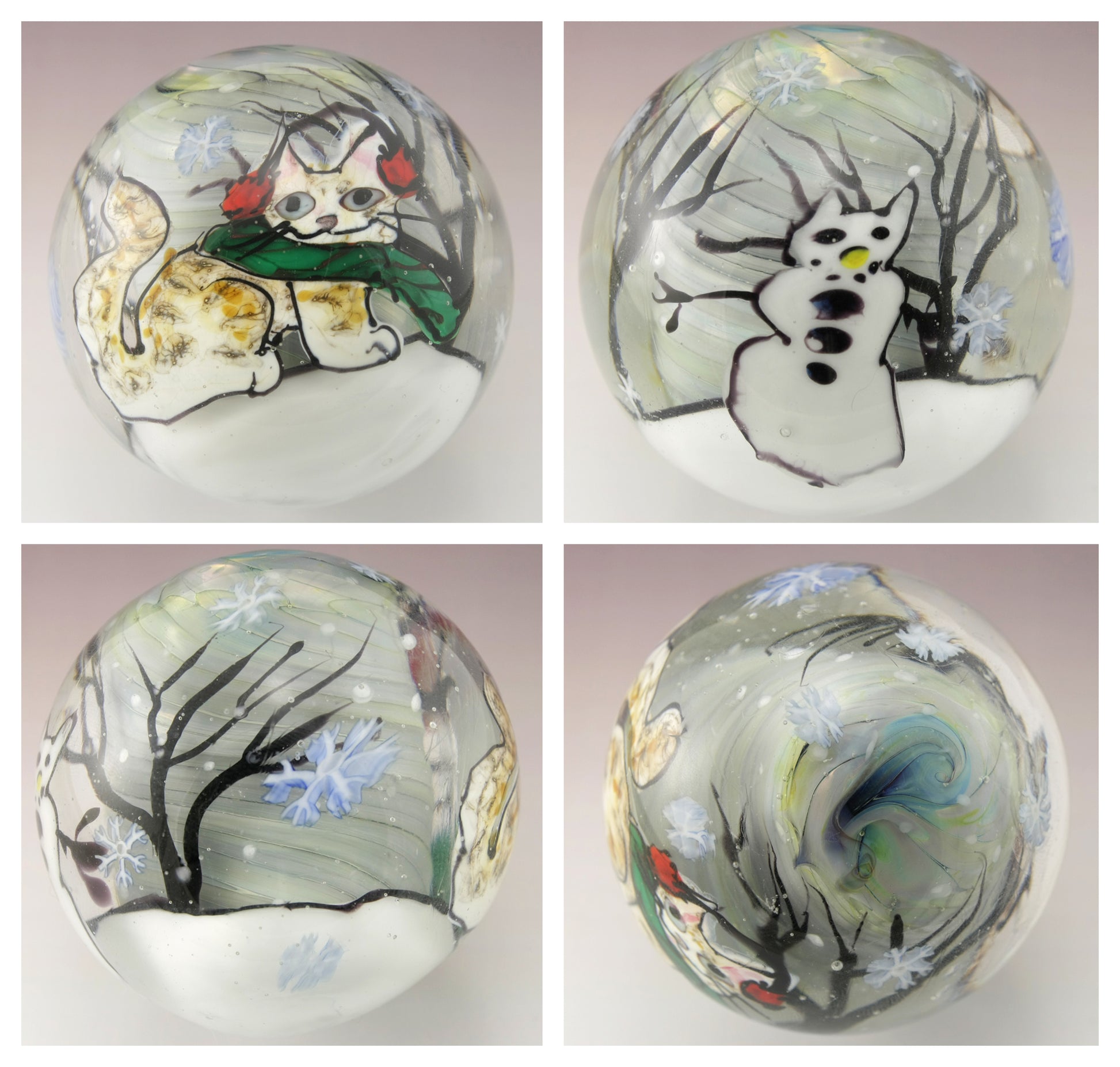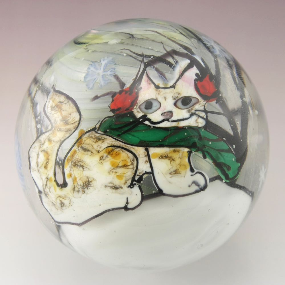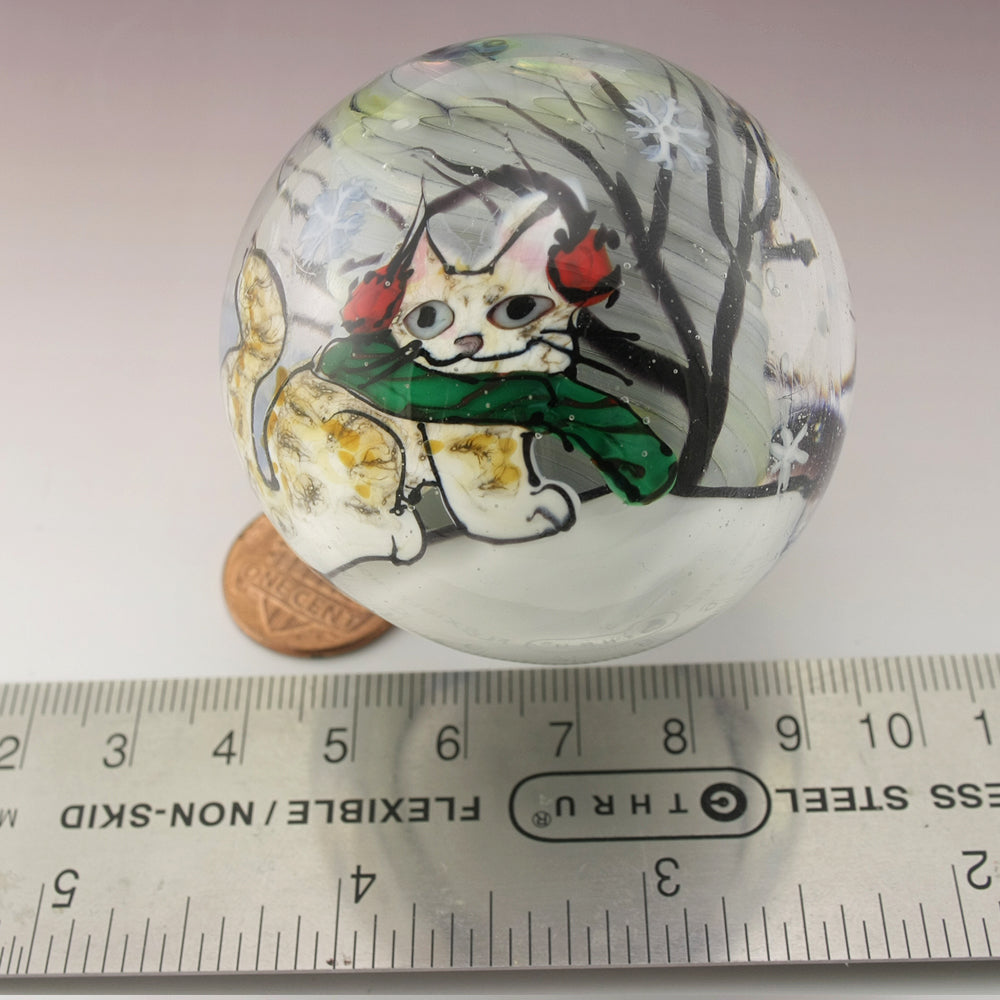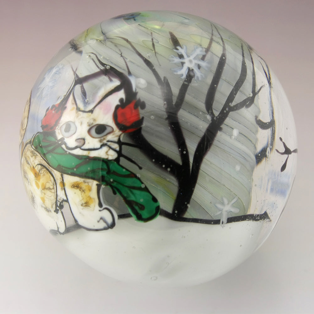This handmade lampwork marble features an adorable tabby kitty with his ear muffs and scarf enjoying the snowy winter weather. There's bare trees and a snowman (um, snowkitty?) with big geometric snowflakes falling to the white ground against a pale silvery blue background.