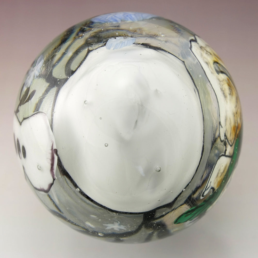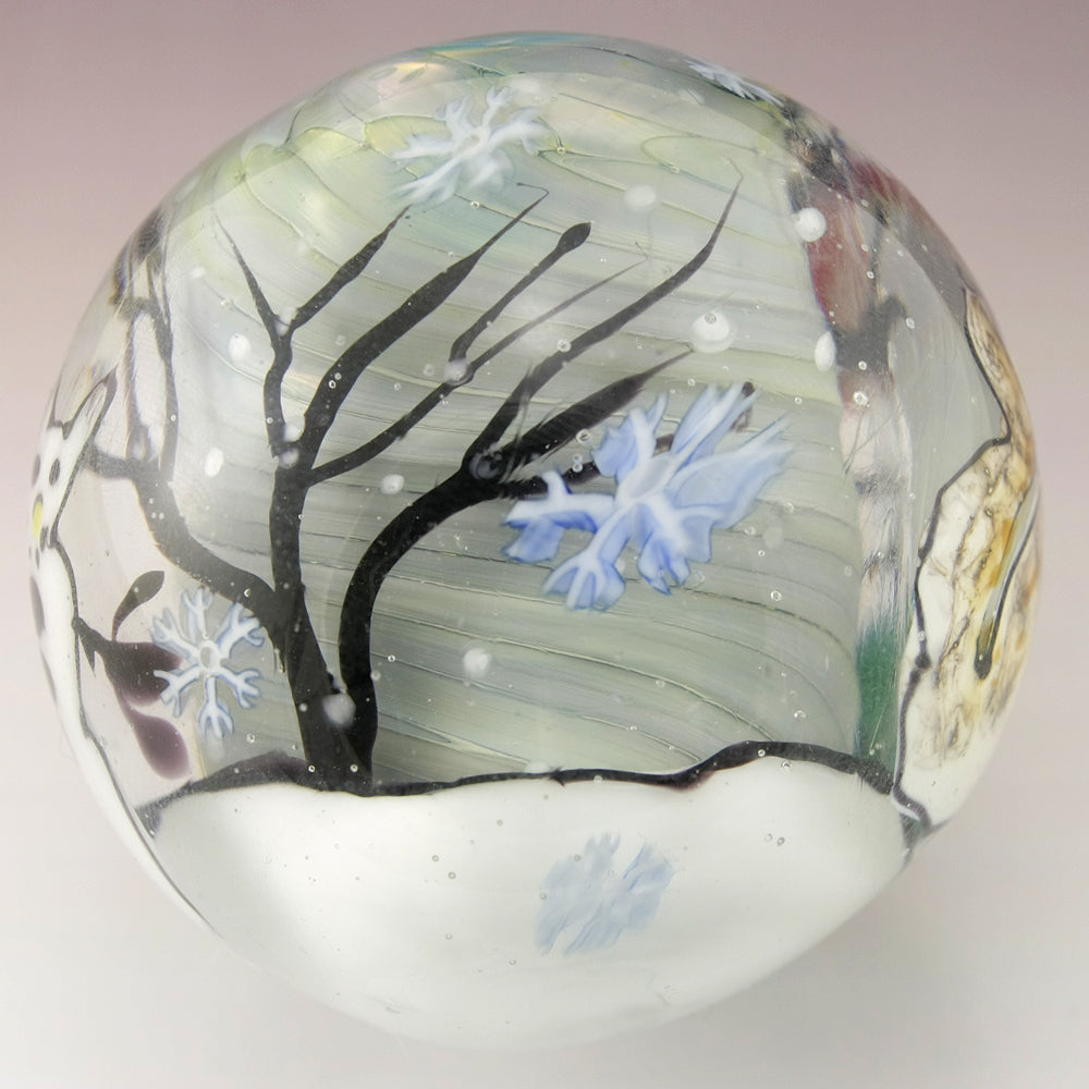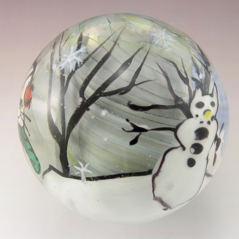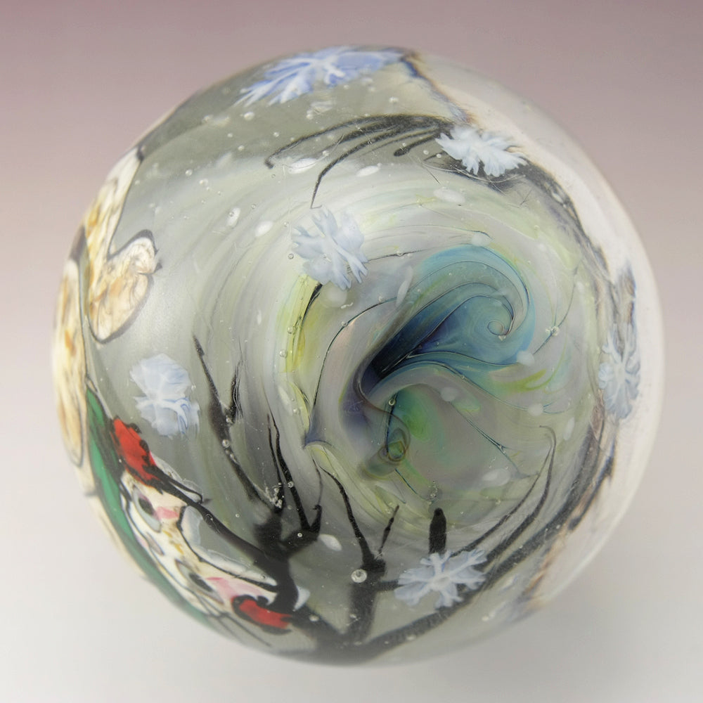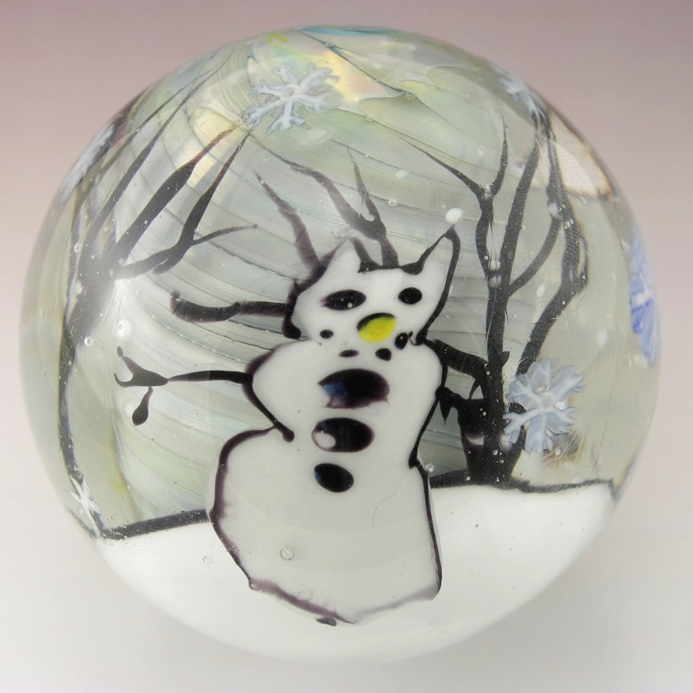 This handmade lampwork marble features an adorable tabby kitty with his ear muffs and scarf enjoying the snowy winter weather. There's bare trees and a snowman (um, snowkitty?) with big geometric snowflakes falling to the white ground against a pale silvery blue background.