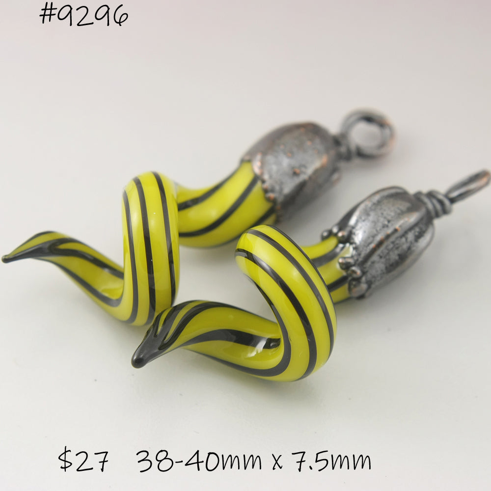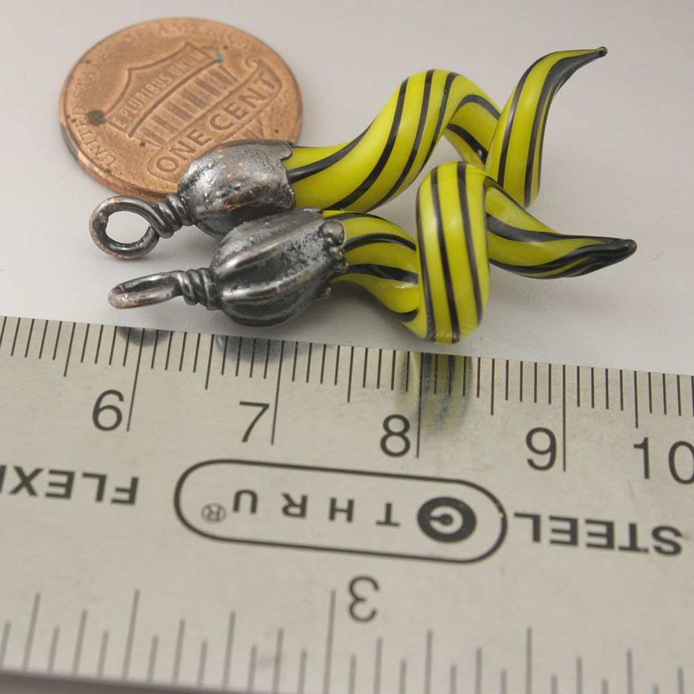 Yellow with Black pinstripes Lampwork Glass Curly Spirals with Copper Electroforming Oxidized pair