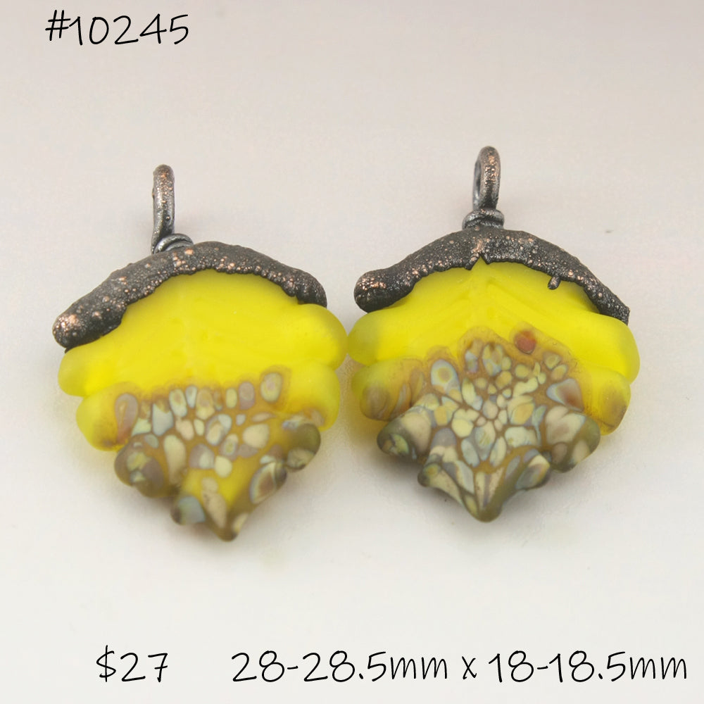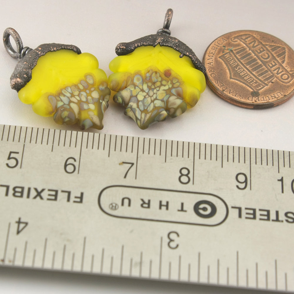 Handmade bright etched yellow lampwork glass leaves with raku frit with copper electroforming oxidized pair.